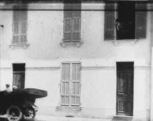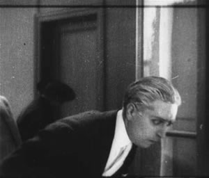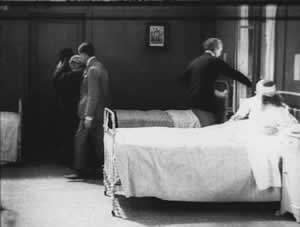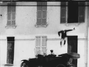 Another scene is even more vigorous. The villainous Esteban visits Jeannette in the hospital, but she and her friends charge him with being a catspaw for another villain, Sakounine. Esteban flees by jumping out the window, dropping to his car and then speeding off. The Feuillade of Les Vampires would have handled this fairly sedately: a shot in the hospital room showing Esteban’s defenestration, then a full shot from outside showing his descent and escape. But here we get a more dynamic rendition of his maneuver, backed by rhythmic editing.