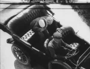 Just as important, however, is his evident realization that quick cutting allows him to present action in exciting bursts. The packed prologue of Barrabas (1919), which crams a family gathering, a high-society party, a roadside robbery, and a dance into eighteen minutes, allots about three seconds per shot. Even more striking are montage-based passages in L’Orpheline (1921). The auto accident which befalls Jeanette and Pierre (a very young René Clair) is rendered in seven staccato shots. After a shot showing the couple driving toward the camera we see: