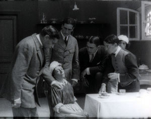 Fig. 2A.7Feuillade tends not to string the heads out in a perfect horizontal but rather to present a graceful curve framing the seated figure. In Fig. 2A.7 (left), the corrupt maid has been put to sleep by the drug she supplied, and the men of the Villa Luciola stand around her in a pattern reminiscent of a question mark tipped over leftward: three-headed arch on the left, an extra head on the right—with the maid Rosette’s face peeping out as a sort of dot.