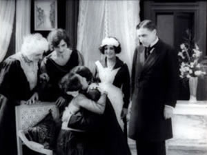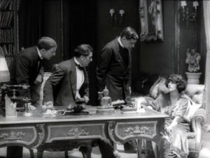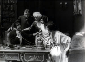 At the Cinema Ritrovato in Bologna in June of this year, I was watching Tih Minh again, and I noticed another tactic Feuillade employs as part of his overall balancing-and-symmetry approach to composition. When several characters gather in the frame, their heads are commonly arranged more or less along a horizontal line—the isocephaly spoken of by art historians, particularly in Renaissance painting. But in Tih Minh, often the story requires one character to be sitting in a chair or on a couch while others bend over him or her—out of curiosity, solicitude, or whatever. How to arrange these heads?