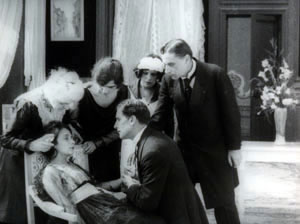 Fig. 2A.10 Fig. 2A.11These arrays of curious heads can yield movements as well. Once more, a group of concerned people at the Villa Luciola assemble around Tih Minh, back from another brush with death (2A.10). The heads cluster around her tightly. But when she revives and embraces Jacques, the onlookers all simultaneously straighten up (2A.11). Even though the changes in position are slight, the fact that everyone moves as a single unit creates the impression of a slow burst in the shot’s center, like a flower opening. Such gentle geometries of movement hard to find in today’s cinema, and observing them in Feuillade reminds us that long ago some directors crafted their images as two-dimensional patterns of bodies in space.