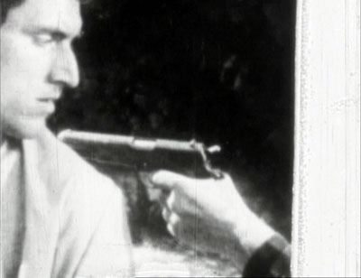 produces onscreen the cascade familiar from the pinhole footage: a pistol, a