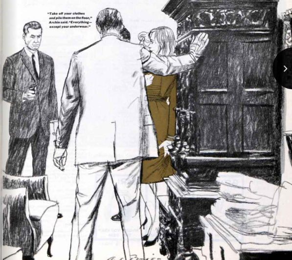 Once more the filigree detail flows in. Archie will watch amusedly from his desk, swiveling to take notes or do some typing. (“I made a note to grin when I got the time.” 47) Cramer must sit fuming in the big red chair and sooner or later he will fling his unlit cigar at Archie’s wastebasket (and will miss). One thing that makes the novels endlessly rereadable, as the fans attest, is looking forward to these rituals, and enjoying how Archie renders them this time. Will Cramer call him Archie or just Goodwin? Will he let Archie take his coat in the hall? Will Archie describe the reddening of Cramer’s face, or his teeth clenching his cigar, or where he situates his fanny on the chair?